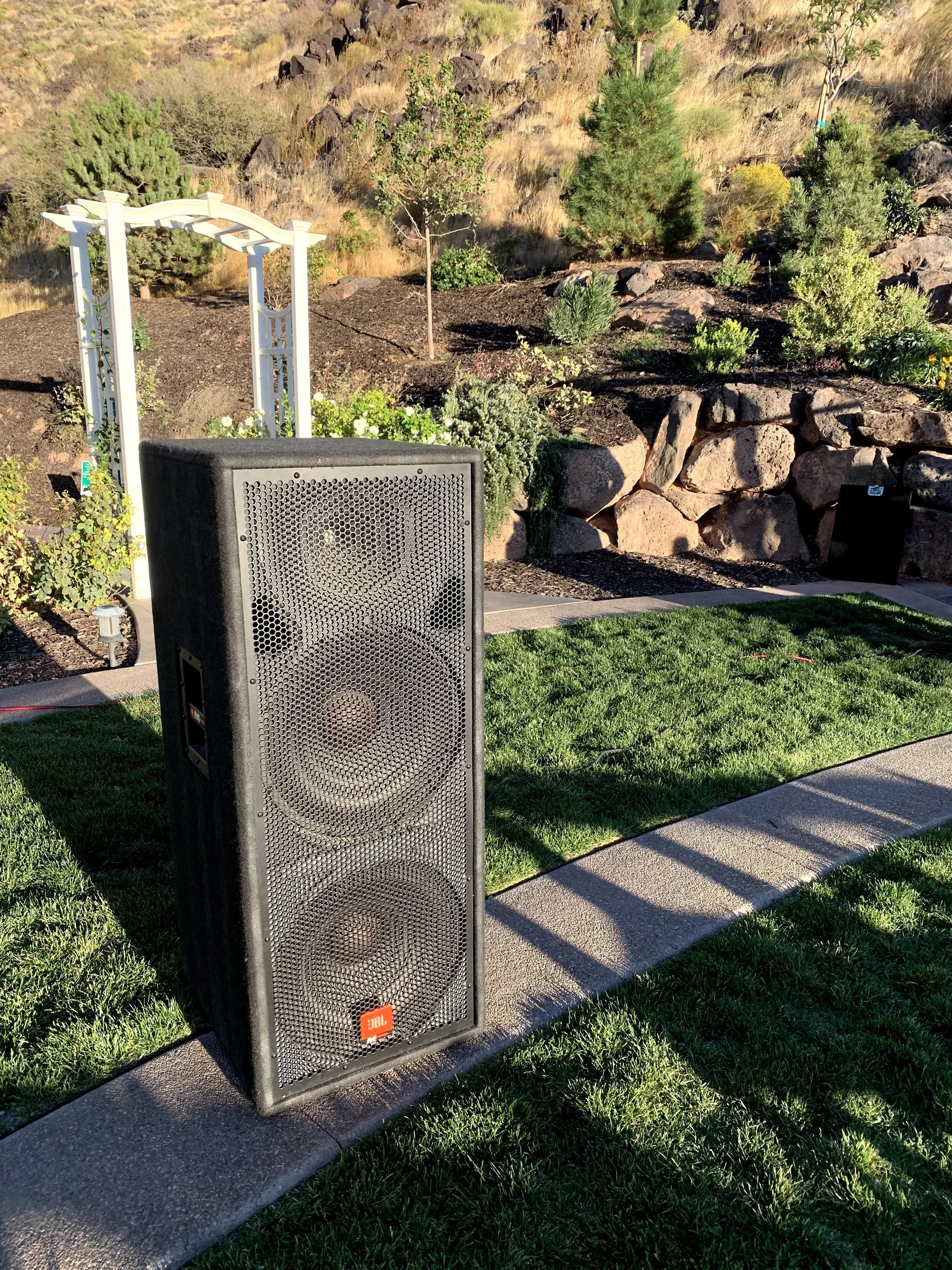 We use JBL Pro speakers with Crown Pro amps to deliver amazing base and rich sound, both indoor and out. Don’t be fooled by others using PA (Voice) systems on tripods.